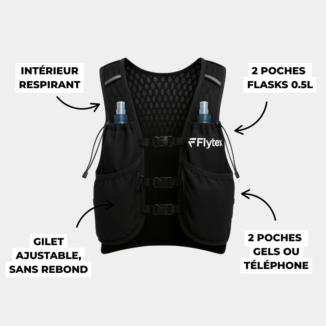 ✔️ 4 poches frontales pour flasks 0,5L, gels ou téléphone